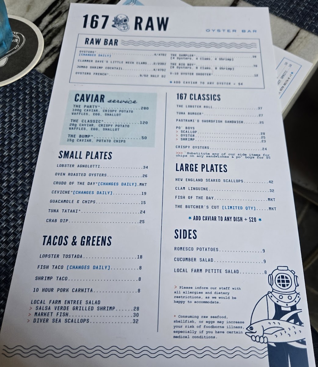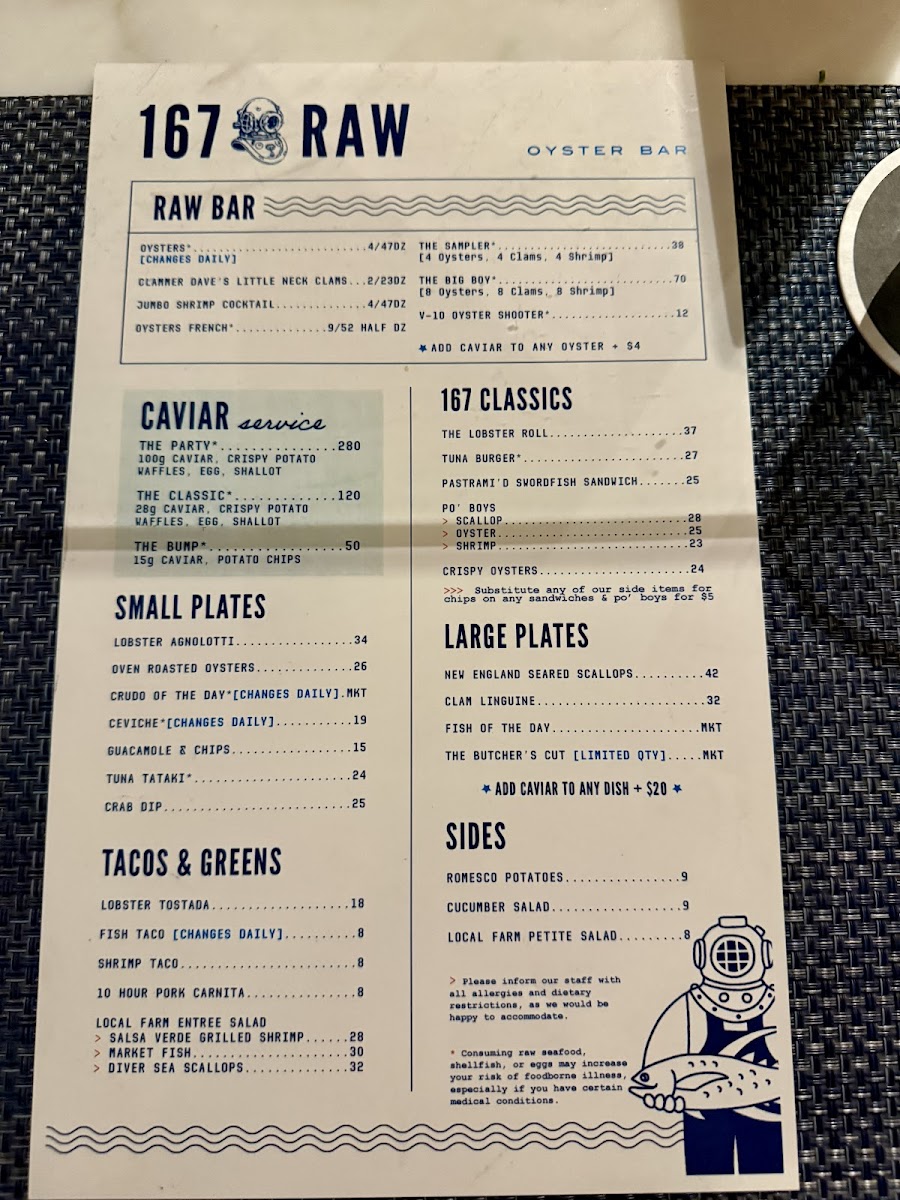 Not to be missed are the famed 167 Classics, featuring their scrumptious Lobster Roll and the flavorful Oyster Po' Boys. For the connoisseur, the caviar service elevates any meal with options that range from classic pairings to extravagant spreads.